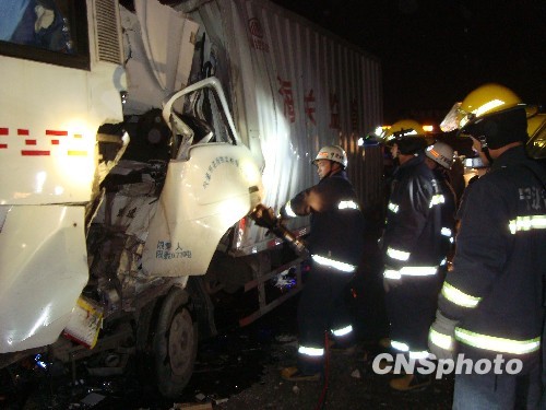 2月24日21时24分,杭甬高速公路浙江省宁波市段塘出口处发生一起交通事故,一辆平头箱式货车与大客车发生追尾事故,造成1死6伤。中新社发 何蒋勇 摄