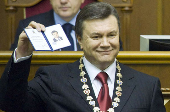 2月25日,在乌克兰首都基辅,新当选的乌克兰总统亚努科维奇在宣誓就职后展示自己的总统证。