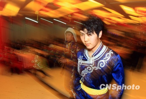 新疆布尔津县蒙古族民众相聚在一家现代化的宴会厅,提前欢度蒙古族民间传统节日——麦德尔节。中新社发 刘新 摄