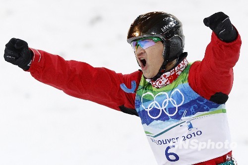 当地时间2月25日,2010年温哥华冬奥会自由式滑雪男子空中技巧决赛在温哥华塞普里斯山滑雪场进行,中国选手刘忠庆获得铜牌。图为刘忠庆在比赛中。中新社发 盛佳鹏 摄