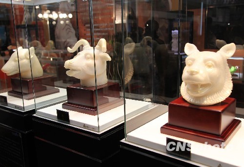 2月26日,台盐公司在台北火车站大厅首次向公众展出用盐雕塑的圆明园十二兽首。这些雕塑是用台湾精盐,由三义木雕师加工雕凿而成。盐雕可置于室内,加上LED照明,带动释放精盐受热后的负离子,让空气环境质量更好。中新社发 耿军 摄