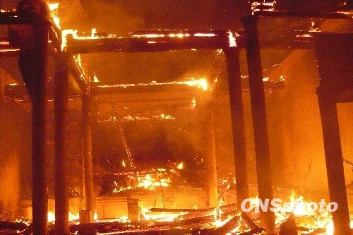 2月26日凌晨1时许,福建宁德福安市坂中乡留安村的一座齐天大圣庙突遭火神“祝融”拜访,火势蔓延迅速。当地消防部门接到报警后,立即赶到现场,经过大约两个小时奋战,大火被完全扑灭。中新社发 陈强 摄