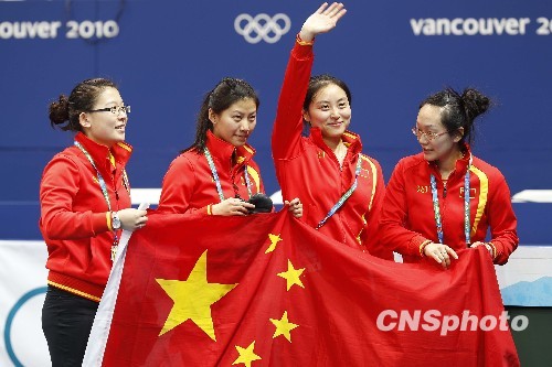 当地时间2月26日,2010年温哥华冬奥会女子冰壶铜牌争夺战在温哥华奥林匹克中心结束,中国队12:6战胜瑞士队夺得铜牌。图为中国队队员庆祝获胜。中新社发 盛佳鹏 摄