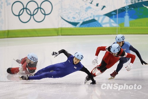 当地时间2月26日,2010年温哥华冬奥会短道速滑男子500米决赛在温哥华太平洋体育馆进行,加拿大名将哈默林-查尔斯终于为东道主摘得金牌,韩国选手盛锡贝(左二)撞线前自己失误摔倒痛失金牌,只获得银牌。中新社发 盛佳鹏 摄