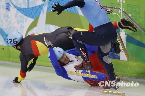 当地时间2月26日,2010年温哥华冬奥会短道速滑男子500米比赛在温哥华太平洋体育馆进行,在四分之一决赛中,法国选手Thibaut Fauconnet(左)与德国选手Tyson Heung在比赛中摔倒的惊险瞬间。中新社发 盛佳鹏 摄