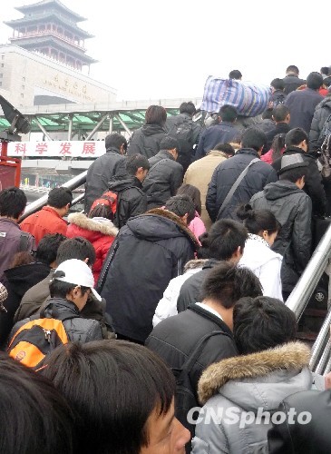 图为北京西客站过街桥挤满了来来往往的旅客。中新社发 钱兴强 摄