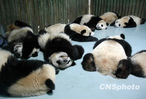 2010年2月26日,上海动物园,10只世博熊猫安然入睡,势态各异,十分可爱。中新社发 阿凯 摄