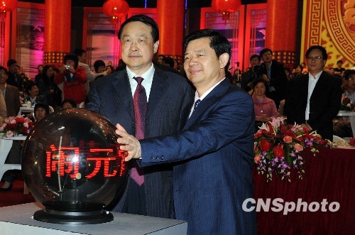 2月27日晚,马祖县长杨绥生(前右)出席在福州马尾举行的第八届“两马同春闹元宵”活动开幕式并与福州马尾经济文化交流合作中心理事长郑有光(前左)共同启动该活动开幕圆球。中新社发 刘可耕 摄