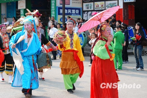 2月28日,中国传统元宵佳节,广西阳朔西街民间艺术表演队在西街主要街道巡游表演,向民众和中外游人展示阳朔民间民俗文艺的精髓。当日,阳朔县举办了以“万盏花灯、万碗汤圆、万条灯谜、万束焰火”为主题的闹元宵活动,把整个阳朔县城扮得火树银花,4万多名中外游客及当地民众参与了丰富多彩的狂欢活动。中新社发 周利朔 摄