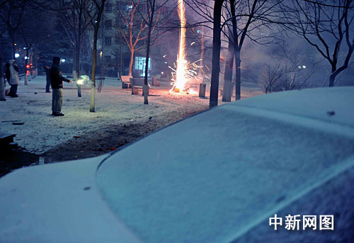 2月28日,北京市民雪夜燃放烟花爆竹,火树银花闹元宵。