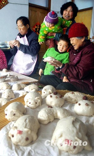 2月28日,郯城县郯城镇城里三街的老人们在制作“虎馍”。中新社发 房德华 摄