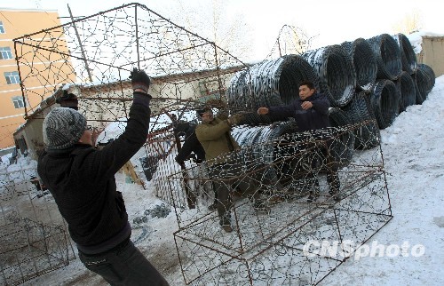 3月1日,新疆阿勒泰地区布尔津县防洪办公室组织工作人员赶制用于河道溃口时抢险固堤的铅丝笼。布尔津县地处额尔齐斯河与布尔津河流经的三角地带,由于冬季强降雪天气,该县山区积雪厚道达到1米以上,部分地区达到1.5米左右。随着春季到来气温不断升高,极易发生各种洪涝灾害。目前,新疆阿勒泰地区已制订了详细的防洪预案,并已储备石料4800立方米,防洪袋45.5万条,铅丝笼5500平方米,以及各类防洪设施。中新社发 刘新 摄