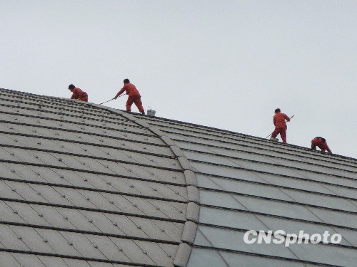 2010年2月28日,北京,几名保洁人员正在清洗国家大剧院外壁上的尘土,使其以靓丽的容貌迎接全国两会的召开。
