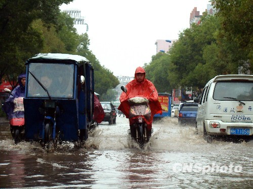 当日,江西省乐平市普降大到暴雨,乐平市珠海中路街道大面积积水,车辆小心翼翼经过。截至3月1日上午11时该市降雨量达41.8毫米。 中新社发 程万海 摄