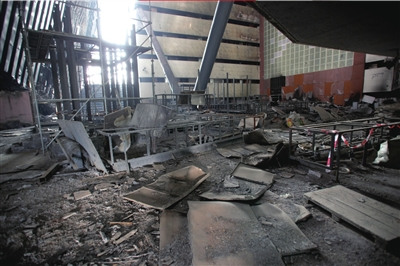 站在30层平台上,能够听到被大火烧化的钢结构部件相互撞击的声音。平台顶部的天庭钢架有多处变形塌陷。顺着被大火熏黑的步梯,记者来到29层和28层,这两层为设备层,过火并不严重。27层的空中餐厅过火十分严重,大火穿堂而过,东、西、南三面玻璃外墙均被大火烤化,大火烧毁了全部内部装修。由于顶棚的装饰装修全被烧毁,通风管道全部暴露在外,很多被烧焦的电线从屋顶垂落下来。多处主体结构承重墙和立柱上都写着“拆”字。在楼层中部的厨房和设备间没有过火痕迹,厨房餐厨设备保存完整。