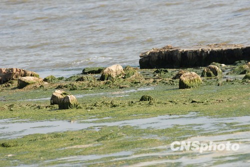 图为因为水位下降露出防浪堤和水下礁石。中新社发 田洪 摄