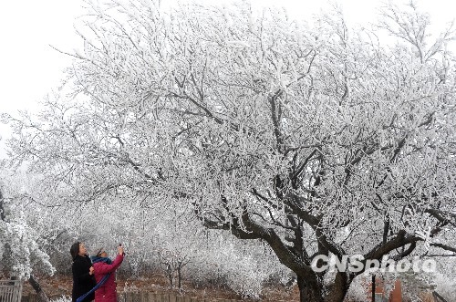 3月1日,江苏连云港市花果山春季出现罕见雾凇美景。在海拨600多米高的山顶玉女峰,由云雾在树枝上凝结而成的雾凇轻盈洁白、蔚为壮观,使人仿佛置身于仙境。中新社发 王春 摄