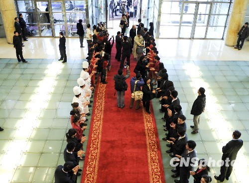 3月2日下午,香港全国人大代表抵达北京饭店,受到服务人员的夹道欢迎。