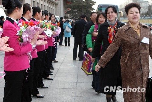 3月2日傍晚,参加十一届全国人大三次会议的新疆代表团抵达驻地京西宾馆,受到宾馆服务员的夹道欢迎。中新社发 任晨鸣 摄