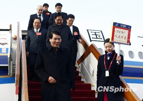图为广东代表团抵京,省人大常委会主任欧广源走下飞机。中新社发 杜洋 摄