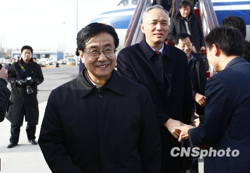 图为浙江省代表团抵京,省委书记赵洪祝走下飞机。中新社发 杜洋 摄