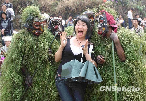 一位女游客遭到“芒篙”的“欺负”。中新社发 覃天阳 摄
