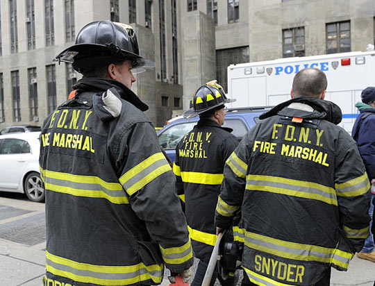 图为消防人员进入美国纽约曼哈顿刑事法院大楼。