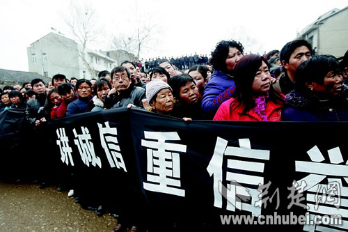 群众自觉排着长队,扯着横幅,静静等待仪式的举行。图片来源:荆楚网
