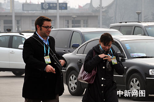 图为外国记者准备进入人民大会堂。中新网记者 吴歆 摄