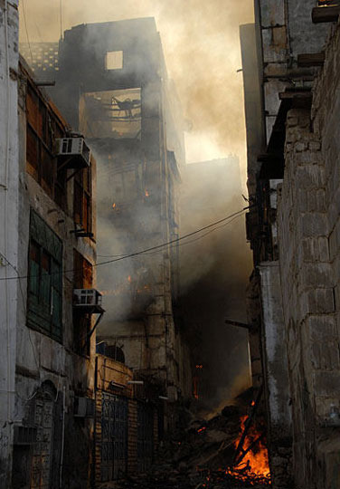 消防人员在沙特阿拉伯红海港口城市吉达扑救着火的建筑。