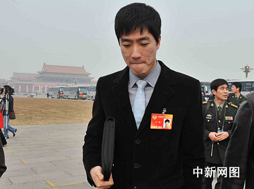 全国政协委员刘翔若有所思地走在天安门广场。中新社记者 贾国荣 摄