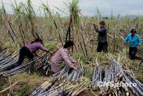 3月3日,福州闽侯县祥谦镇江中村村民在甘蔗地里抢收被狂风刮断的甘蔗。中新社发 刘可耕 摄