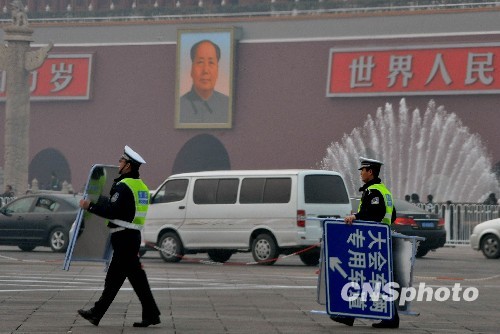 2010年3月3日,两名警察在北京天安门前为“两会”特设交通标志。中新社发 贾国荣 摄