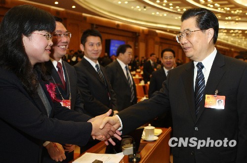 3月4日上午,十一届全国人大三次会议第一次主席团会议在北京人民大会堂举行,胡锦涛出席会议后亲切慰问为大会的工作人员。