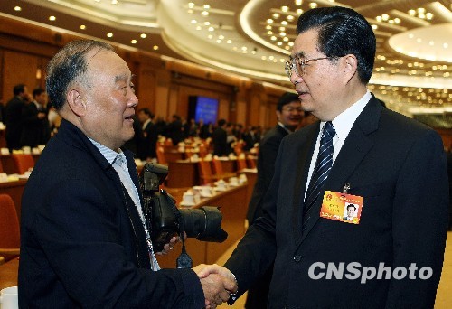 胡锦涛出席会议后亲切慰问年近古稀的著名摄影记者王新庆。中新社发 任晨鸣 摄