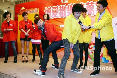 3月4日,香港人气歌星陈伟霆(左)、洪卓立出席《博爱欢乐传万家》记者会,大玩“拉毛巾”游戏。中新社发 洪少葵 摄