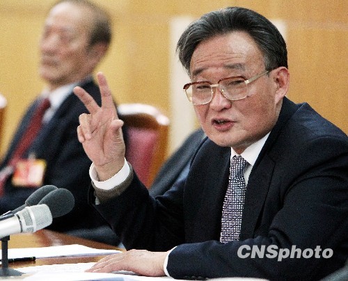 中共中央政治局常委、全国人大常委会委员长吴邦国参加会议并就国民经济发展、海峡两岸关系等发表讲话。中新社发 任晨鸣 摄