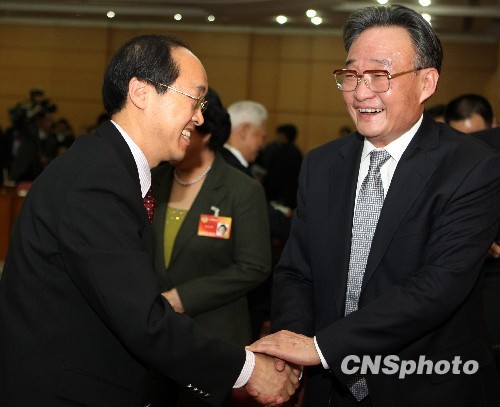 中共中央政治局常委、全国人大常委会委员长吴邦国参加会议时与民革中央副主席万鄂湘等握手交谈。中新社发 任晨鸣 摄