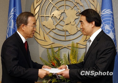 3月4日下午,新任中国常驻联合国代表李保东在纽约联合国总部向联合国秘书长潘基文递交了全权证书。
