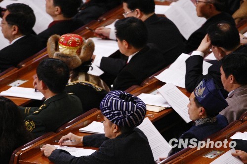图为参会代表听取温家宝作政府工作报告。中新社发 杜洋 摄