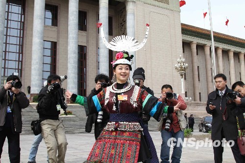 3月5日,刚参加完第十一届全国人大三次会议的苗族女代表雷阿幼朵在人民大会堂前翩翩起舞。中新社发 韩苏原 摄