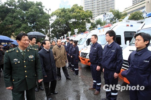 3月5日,世博安保机动指挥车亮相上海,上海警备区司令员江勤宏(左一)、副市长沈骏(左二)等视察。世博安保机动指挥车亮相上海,该指挥车装置有多种通信设备和现场图像监视设备,车内有指挥席位和器材,在突发事件发生时,可实施应急处置指挥。中新社发 潘索菲 摄