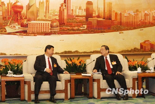 3月5日,中共中央政治局常委、国家副主席习近平到上海代表团参加审议政府工作报告时,与上海市委书记俞正声交谈。