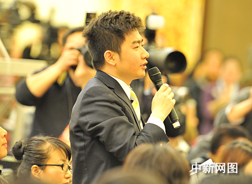 3月6日上午10点,国家发展和改革委员会主任张平、财政部部长谢旭人、商务部部长陈德铭、中国人民银行行长周小川在人民大会堂三楼金色大厅就加强和改善宏观调控问题答记者提问。 图为提问的记者。中新网记者 贾国荣 摄