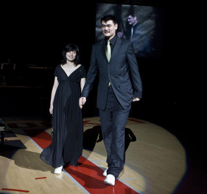 虽然叶莉已经怀孕7个月,但是今日黑色宽松连衣裙出现的她并不能让人看到她的大肚子,最近在积极休息的她看起来气色非常不错,同时也变漂亮了许多,而姚明今日一身黑色西装加上金黄色领带和叶莉显得十分般配。