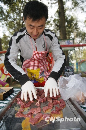 图为“虎爸”在饲养员指导下,为小白虎准备食物。中新社发 刘冉阳 摄