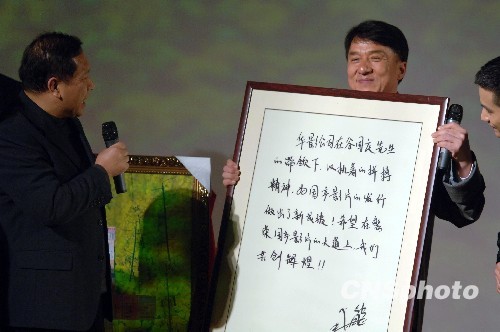 图为成龙为华夏电影发行公司送上大礼。中新社发 李学仕 摄