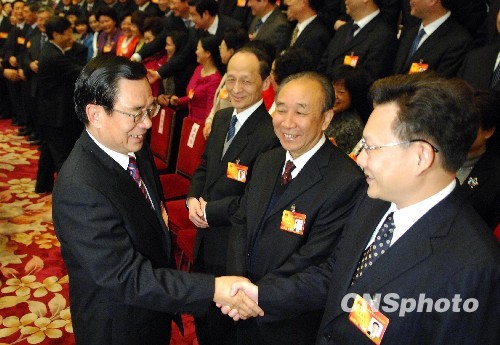 3月7日下午,中共中央政治局常委、中央纪律检查委员会书记贺国强(左)在北京人民大会堂,参加十一届全国人大三次会议江西代表团全体会议,与代表们一起审议政府工作报告,听取意见和建议。