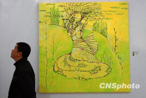 3月7日,新疆乌鲁木齐文化创意集聚区七纺街举办当代女性主题艺术联展,一位男性观众慕名前来观看。据了解,本次艺术联展共吸引30余位女性艺术家参加,油画、国画、刺绣等展出作品形式多样,众艺术家用女性独特的视角为观众展现了一个全新的艺术空间,迎接“三八”国际劳动妇女节100周年。