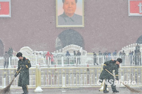 3月8日清晨,武警士兵在北京天安门广场清扫积雪。当天,十一届全国人大三次会议在人民大会堂举行第二次全体会议在人民大会堂召开。中新社发 贾国荣 摄
